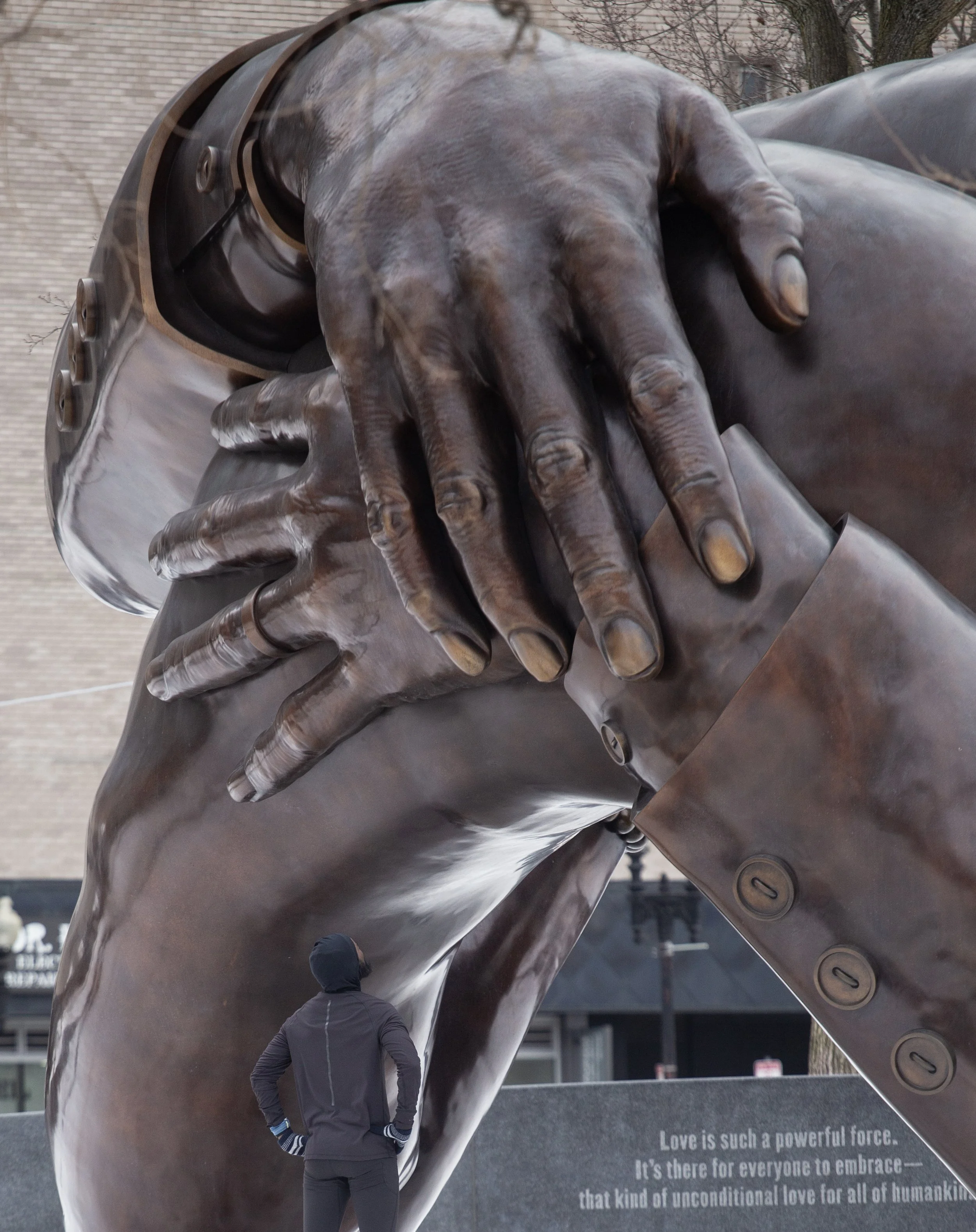 For the cool down, after the hill repeats session, a loop around the Common brings you past The Embrace, the sculpture honoring Martin Luther King Jr. and Coretta Scott King, who met in Boston in 1952. There are no faces to fix my gaze on, no pedestal to elevate the moment, no single angle that explains it. Just bronze arms locked mid-gesture. As I circle, the sculpture shifts. From one side it feels incomplete. From another, it feels like motion briefly paused rather than finished.