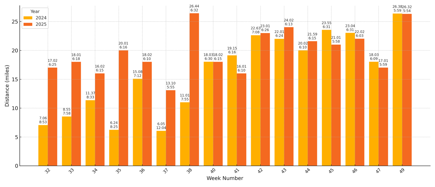 Early in the cycle, from July through September, both builds followed a similar progression, with gradual mileage increases and planned down weeks to absorb the workload. The divergence emerged later. In the 2025 build, weekly mileage remained consistently higher from late September through November, settling into a steady upper range rather than oscillating sharply. Both cycles show a pronounced drop in early October. In 2024, this coincided with travel in Italy. In 2025, it followed the Berlin Marathon and a brief illness. The rebound in 2025 was faster and more decisive, as I aimed to preserve fitness. Recovery was facilitated by a controlled Berlin effort, as conditions were not conducive to a personal best.