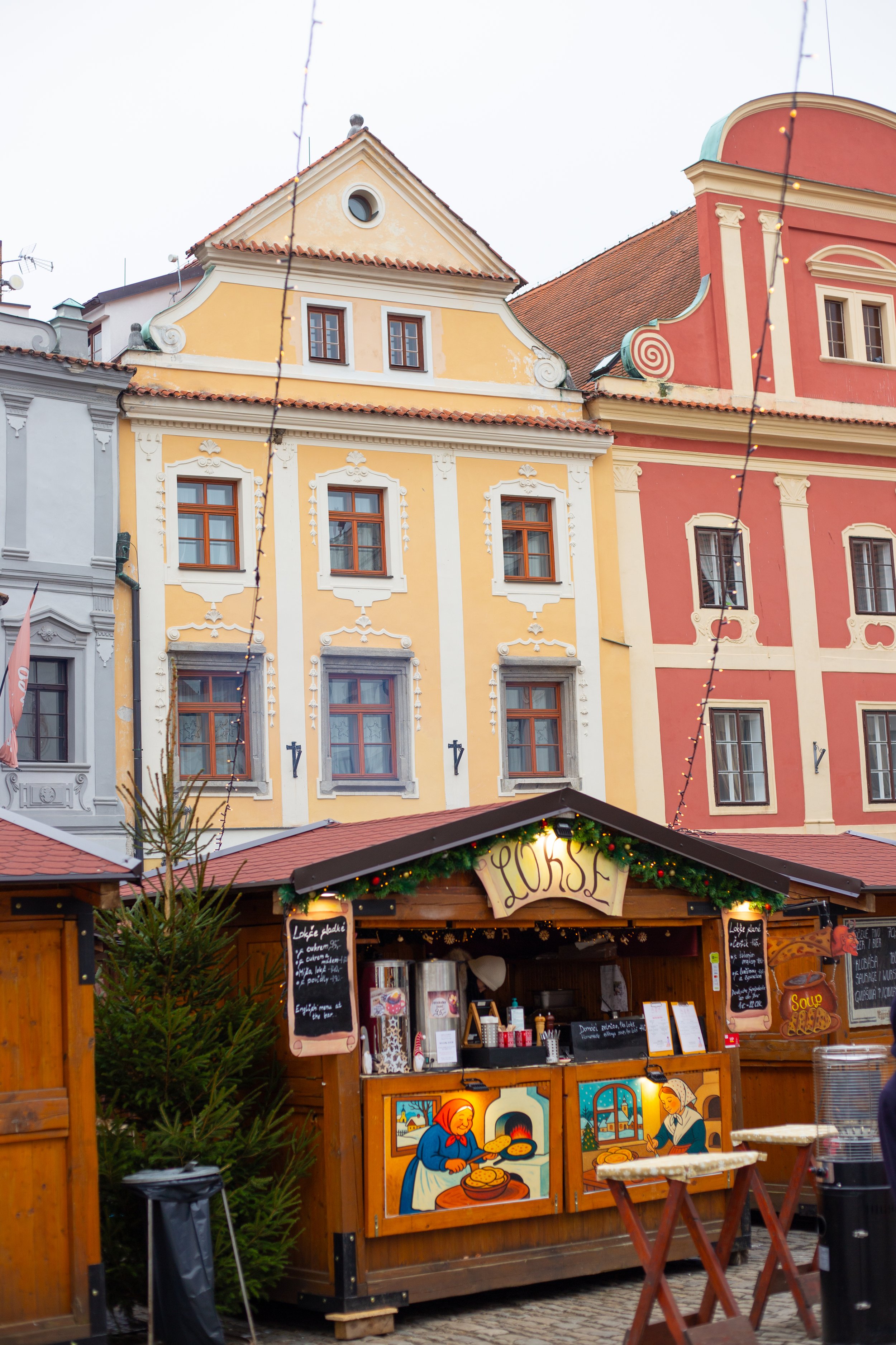 Below us, the square glows, a soft amber light settling gently onto cobblestones polished smooth by centuries of footsteps. Strings of lights drape lazily from wooden market stalls. The air smells of fresh evergreen pine, layered with cinnamon, cloves, and mulled cider. Christmas music drifts through the square. “Jingle Bells. Jingle Bells.” In English. This catches me off guard. We are in the Czech Republic. I expected Czech carols.