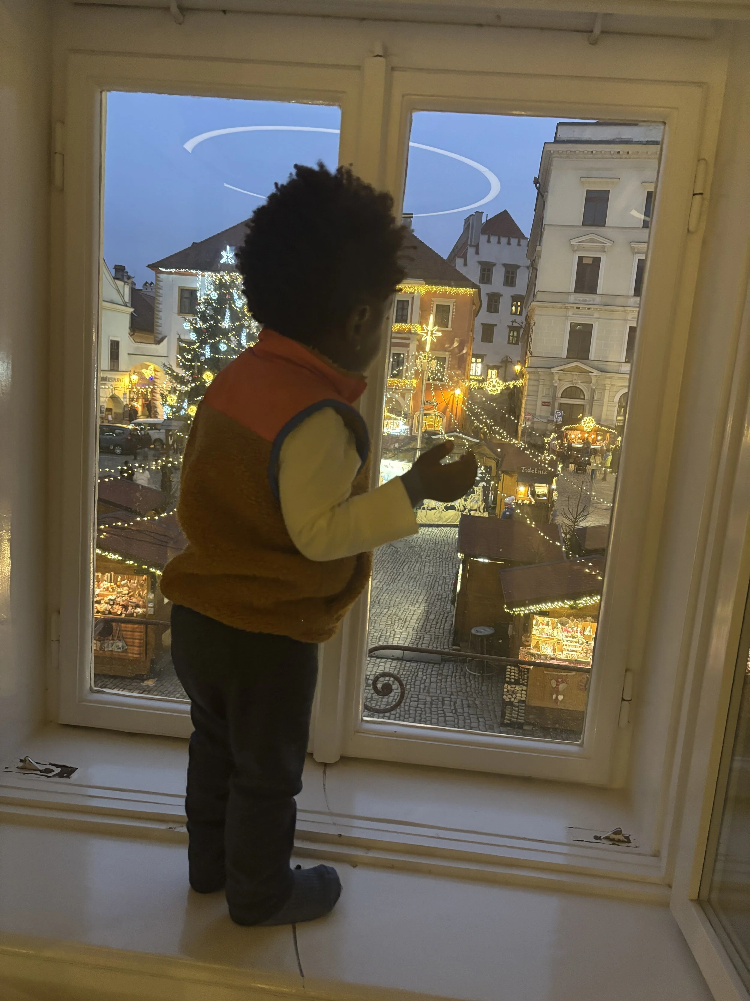 My son Kai presses his face against the window at dusk, looking down from the second floor of our hotel, the Old Inn, set directly on Svornost Square. The glass fogs slightly from his breath. He scans the scene, pauses, and delivers his verdict with scientific precision: wow.
