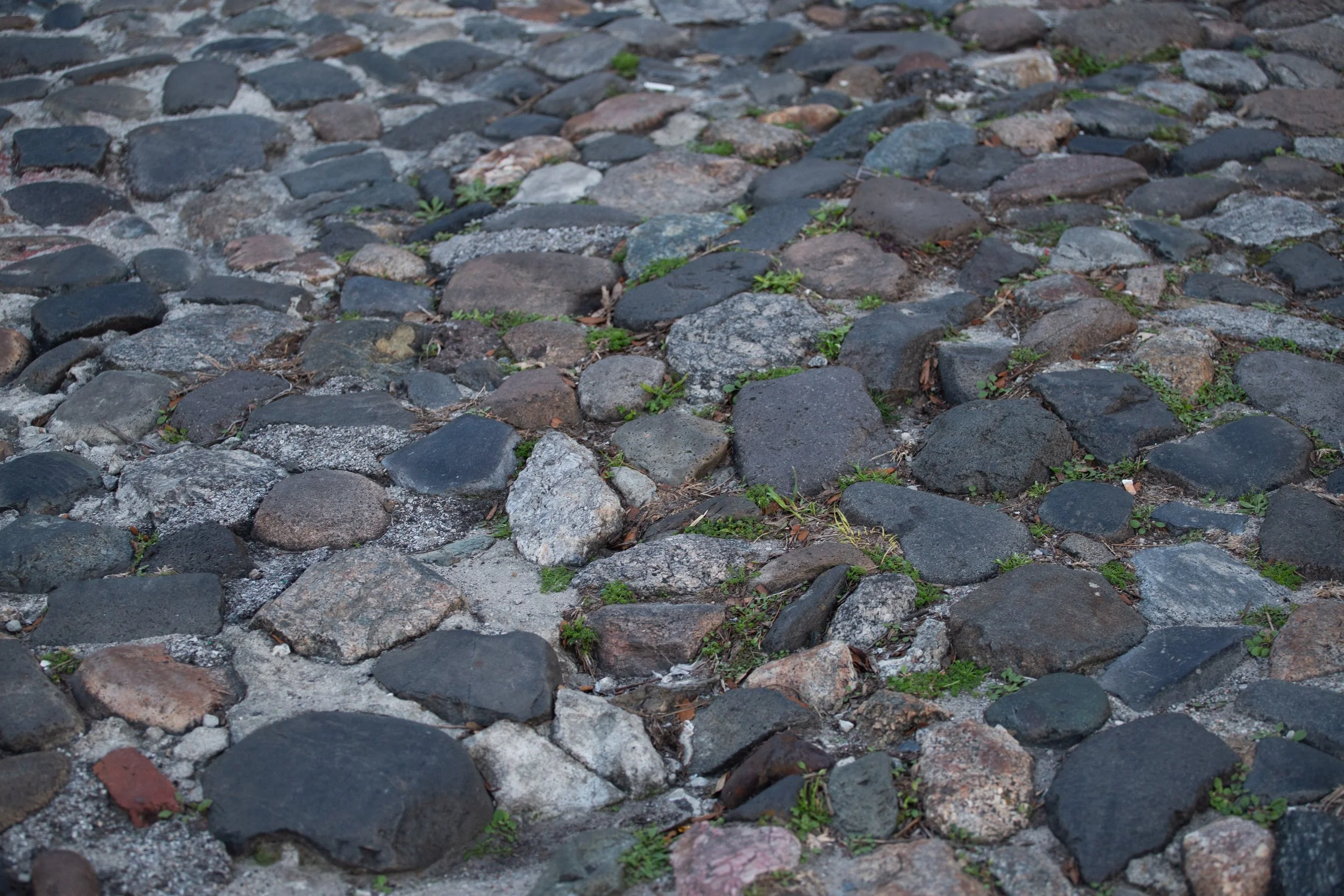 These stones have traveled farther than most who cross them today. Gathered as ballast from ships out of Madeira, Spain, the British Isles, Canada — chert, quartz, granite, basalt — they arrived as dead weight and were discarded onto the waterfront when the real cargo was unloaded. Absorbed into the city's foundation, as so many things here have been. Cotton passed over them. Rice passed over them. Human beings passed over them.