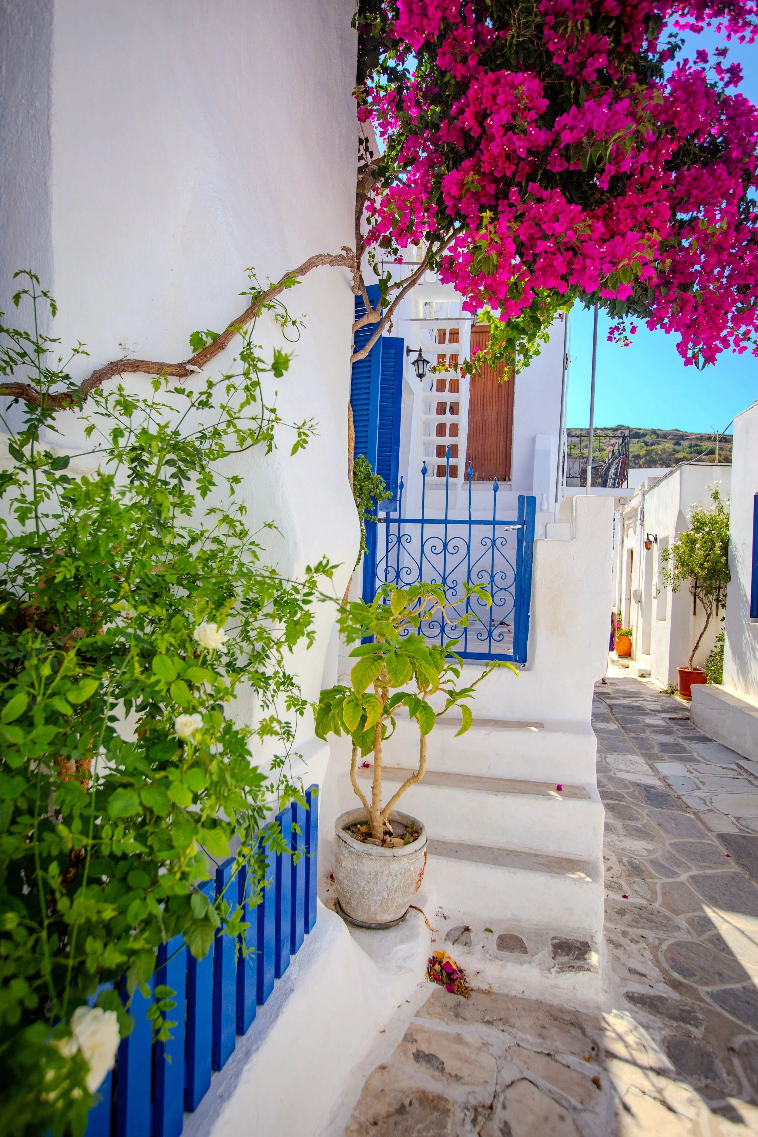 Across the Greek islands, bougainvillea is used both for beauty and practicality. The plant thrives in dry, sunny conditions, making it well suited to the island climate. Its dense growth provides shade along walls, courtyards, and narrow lanes, helping cool homes during hot summers. Visually, the bright pinks, purples, and whites create contrast against whitewashed buildings and stone paths, giving villages a recognizable look. Over time, bougainvillea has become part of everyday island architecture, shaping how places are built, walked through, and remembered in Greece.